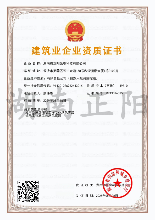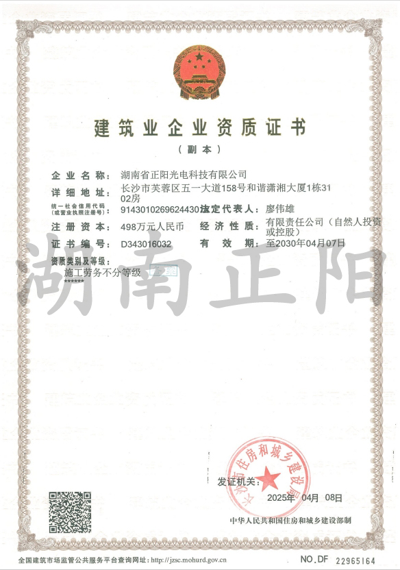2025年4月8日,經(jīng)長沙市住房和城鄉(xiāng)建設(shè)局審核批準(zhǔn),湖南省正陽光電科技有限公司成功獲得“施工勞務(wù)”資...